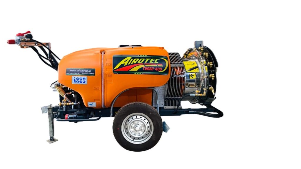 Air-assisted trailed sprayers in 400 L capacity with 550 mm or 616 mm fans for vineyard and orchard spraying, suited for grapes, pomegranates, oranges, mangoes, and other crops.