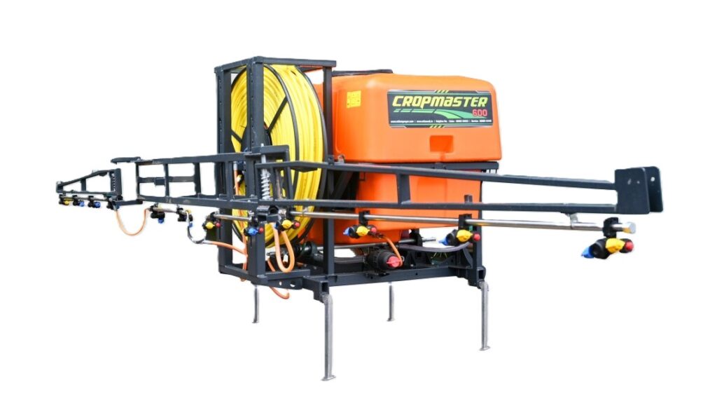 What is the tank capacity and boom width of the Cropmaster Reel+Boom 600 sprayer? 600 L tank; boom options 20/30/40 ft; reel hose supports up to 1000 ft remote reach.